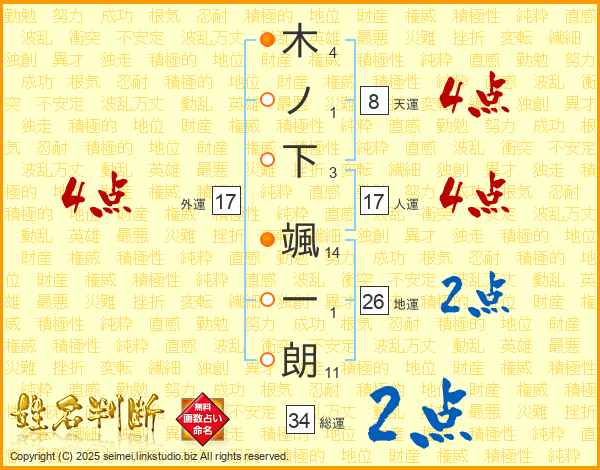 生活面を象徴する運勢です。外部から受ける影響力を表し、結婚運、家庭運や職場、環境への順応性を表します。総運から人運を引いた画数。姓や名が1文字の場合を除く。