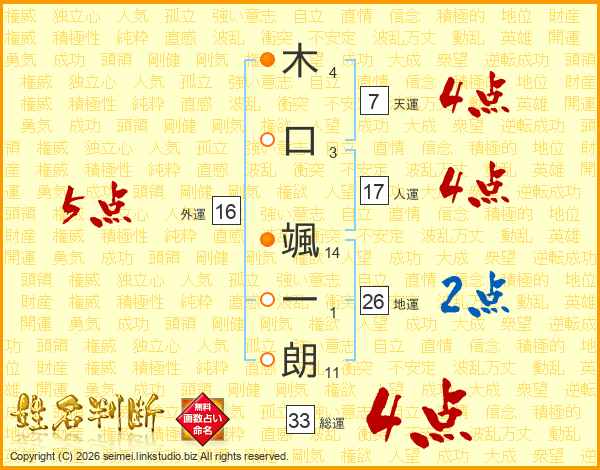 木(4画)口(3画) 颯(14画)一(1画)朗(11画)