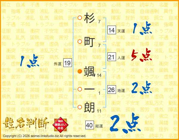 杉(7画)町(7画) 颯(14画)一(1画)朗(11画)