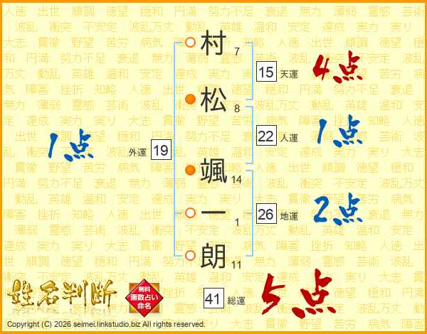 村(7画)松(8画) 颯(14画)一(1画)朗(11画)