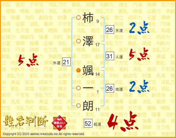 柿(9画)澤(17画) 颯(14画)一(1画)朗(11画)