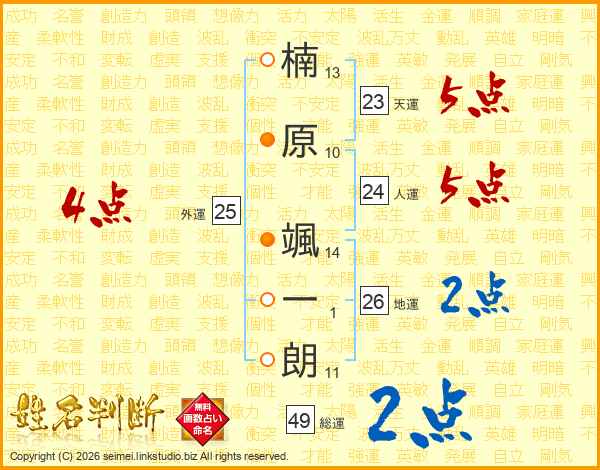 楠(13画)原(10画) 颯(14画)一(1画)朗(11画)