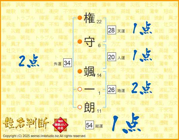 権(22画)守(6画) 颯(14画)一(1画)朗(11画)