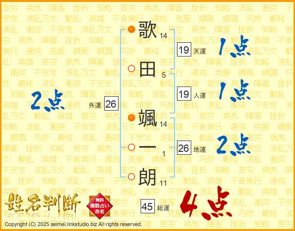 歌(14画)田(5画) 颯(14画)一(1画)朗(11画)