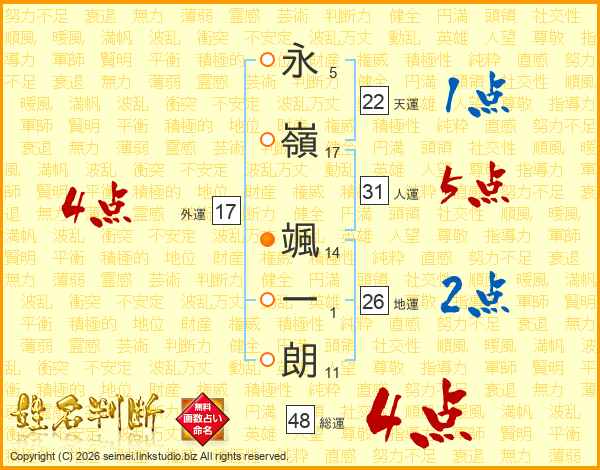 永(5画)嶺(17画) 颯(14画)一(1画)朗(11画)