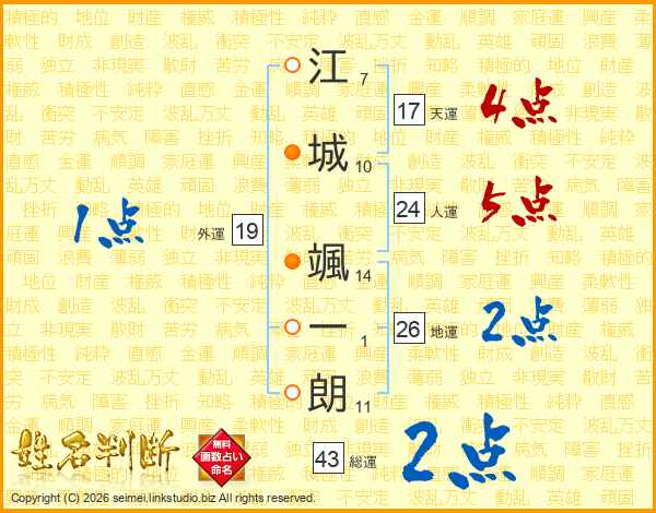 江(7画)城(10画) 颯(14画)一(1画)朗(11画)