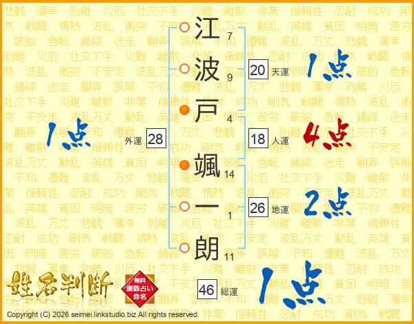 江(7画)波(9画)戸(4画) 颯(14画)一(1画)朗(11画)