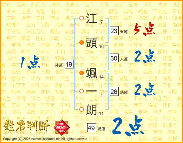 江(7画)頭(16画) 颯(14画)一(1画)朗(11画)