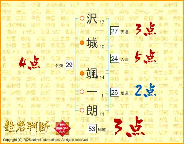 沢(17画)城(10画) 颯(14画)一(1画)朗(11画)