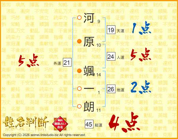 河(9画)原(10画) 颯(14画)一(1画)朗(11画)