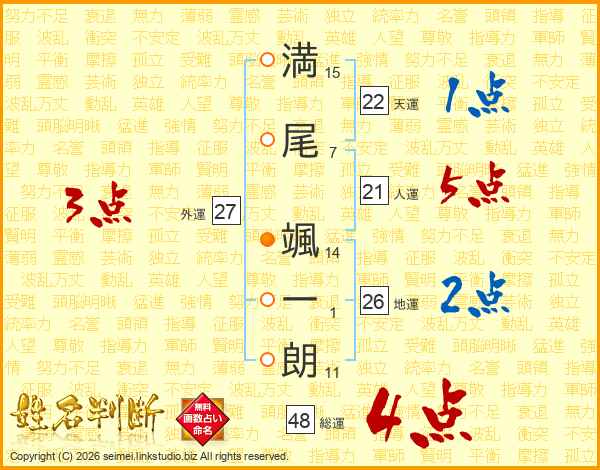 満(15画)尾(7画) 颯(14画)一(1画)朗(11画)