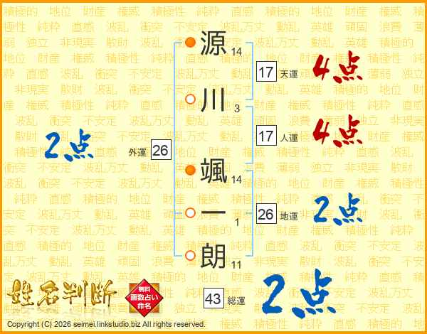源(14画)川(3画) 颯(14画)一(1画)朗(11画)