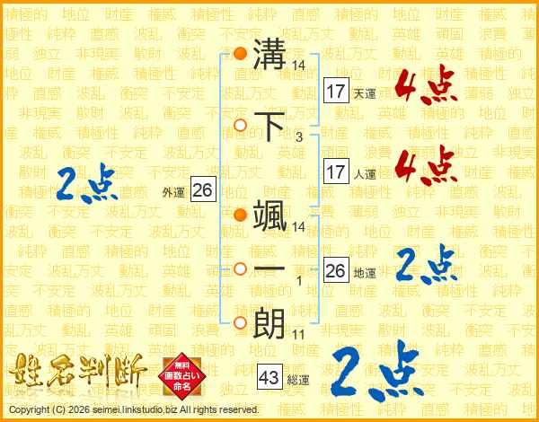生活面を象徴する運勢です。外部から受ける影響力を表し、結婚運、家庭運や職場、環境への順応性を表します。総運から人運を引いた画数。姓や名が1文字の場合を除く。