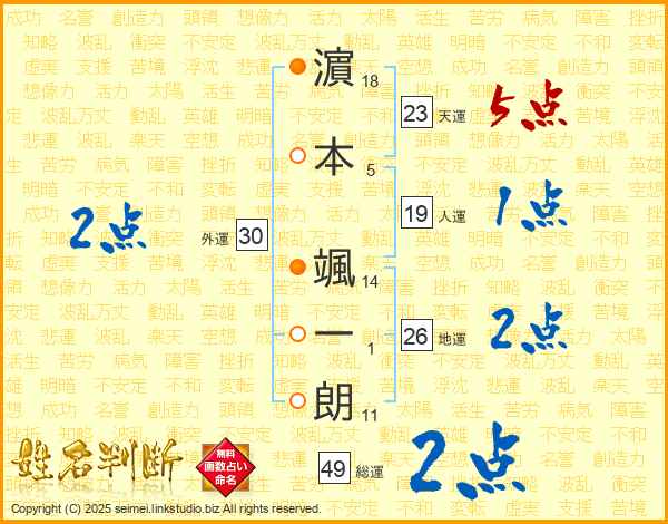 濵(18画)本(5画) 颯(14画)一(1画)朗(11画)