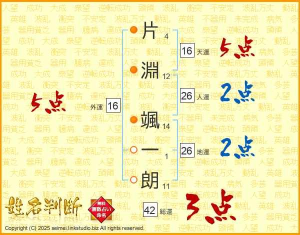 片(4画)淵(12画) 颯(14画)一(1画)朗(11画)