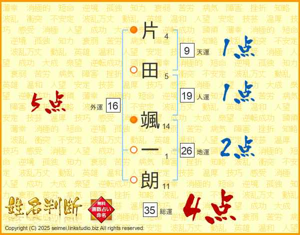 片(4画)田(5画) 颯(14画)一(1画)朗(11画)