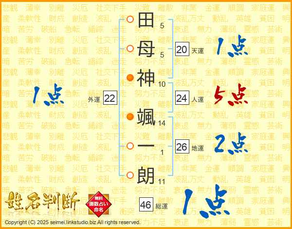 田(5画)母(5画)神(10画) 颯(14画)一(1画)朗(11画)