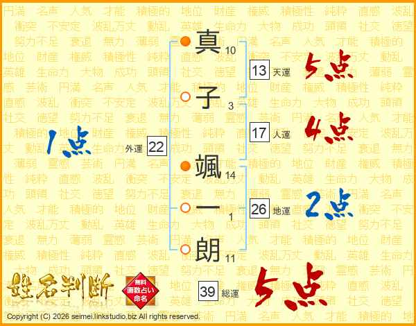 真(10画)子(3画) 颯(14画)一(1画)朗(11画)