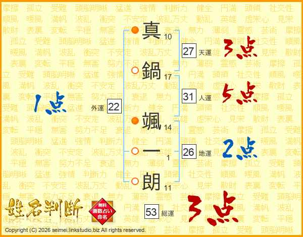 真(10画)鍋(17画) 颯(14画)一(1画)朗(11画)