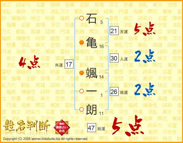 石亀颯一朗さんの天運は21画の5点!