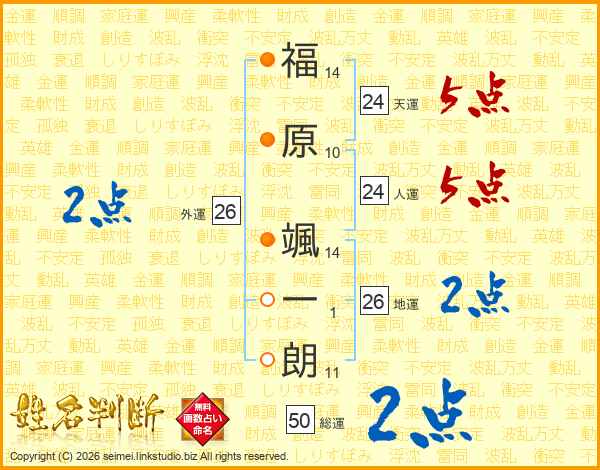 福(14画)原(10画) 颯(14画)一(1画)朗(11画)