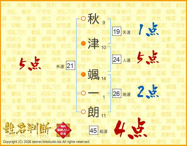秋(9画)津(10画) 颯(14画)一(1画)朗(11画)