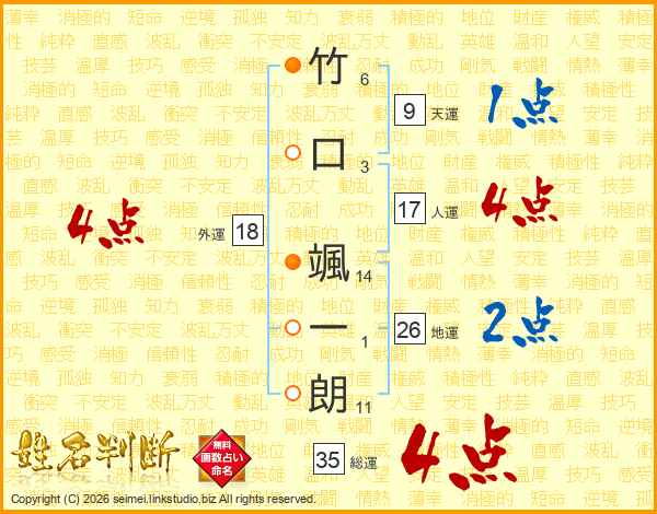 竹(6画)口(3画) 颯(14画)一(1画)朗(11画)
