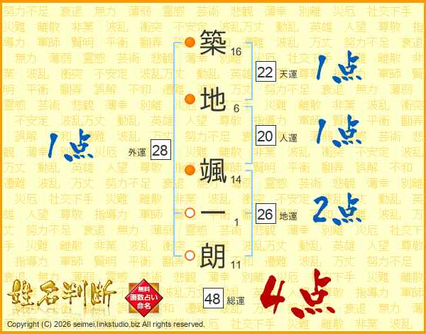 築(16画)地(6画) 颯(14画)一(1画)朗(11画)