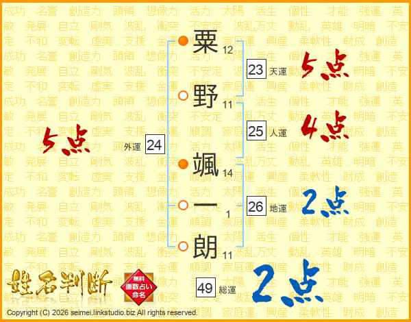粟(12画)野(11画) 颯(14画)一(1画)朗(11画)