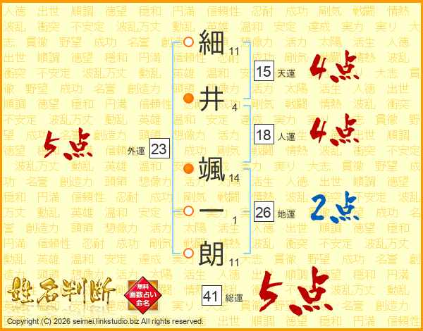 細(11画)井(4画) 颯(14画)一(1画)朗(11画)