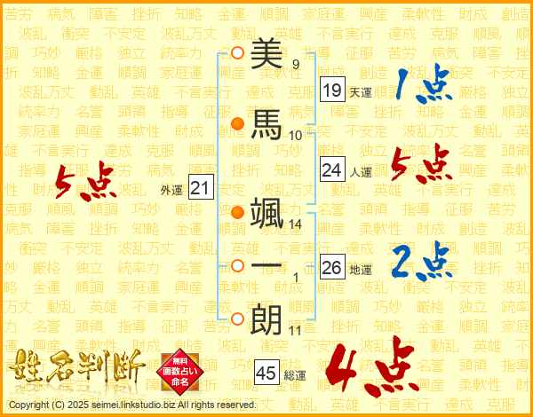 美(9画)馬(10画) 颯(14画)一(1画)朗(11画)