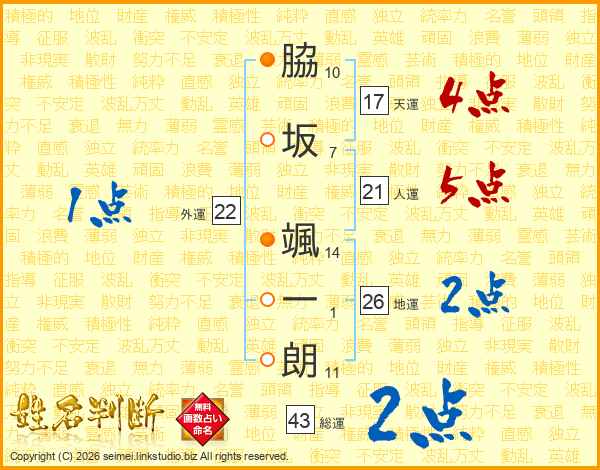 脇(10画)坂(7画) 颯(14画)一(1画)朗(11画)