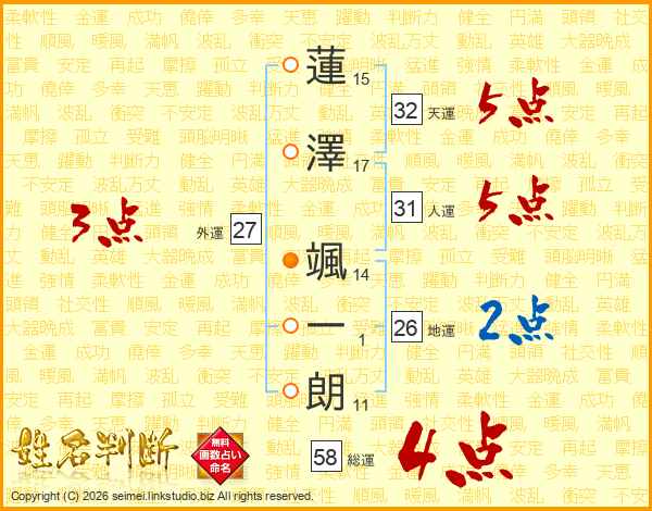 蓮(15画)澤(17画) 颯(14画)一(1画)朗(11画)