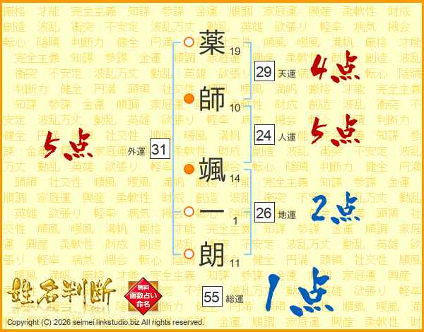 薬(19画)師(10画) 颯(14画)一(1画)朗(11画)