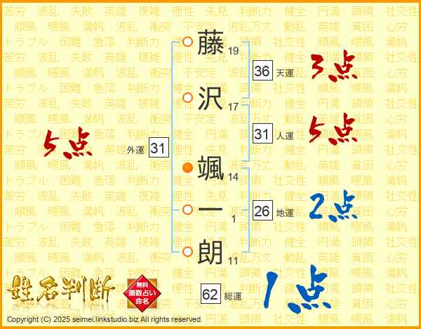 藤(19画)沢(17画) 颯(14画)一(1画)朗(11画)