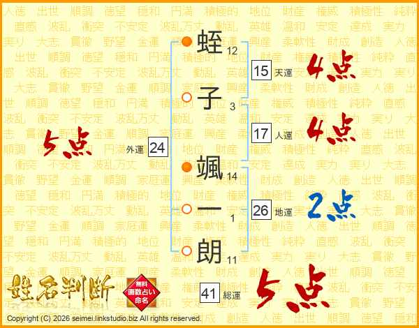 蛭(12画)子(3画) 颯(14画)一(1画)朗(11画)
