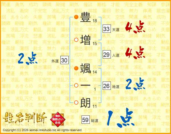 豊(18画)増(15画) 颯(14画)一(1画)朗(11画)