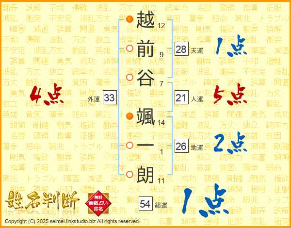 越(12画)前(9画)谷(7画) 颯(14画)一(1画)朗(11画)