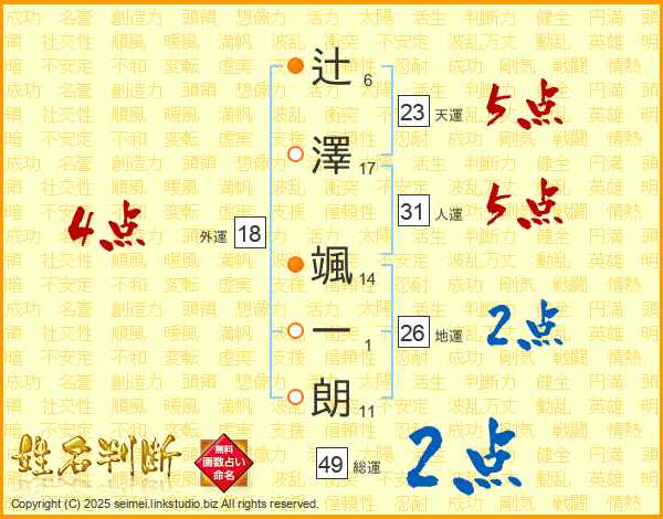 辻(6画)澤(17画) 颯(14画)一(1画)朗(11画)