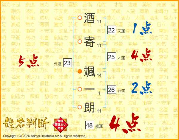 酒(11画)寄(11画) 颯(14画)一(1画)朗(11画)