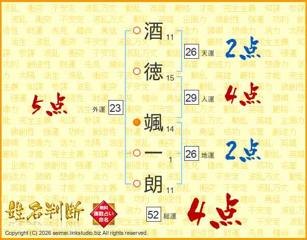 酒(11画)徳(15画) 颯(14画)一(1画)朗(11画)