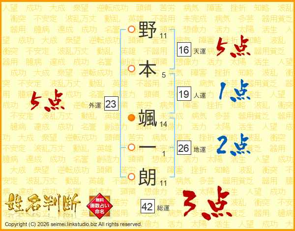 野(11画)本(5画) 颯(14画)一(1画)朗(11画)
