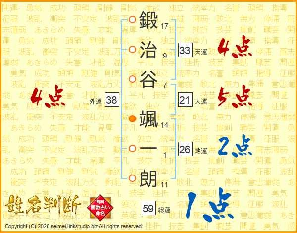 鍛(17画)治(9画)谷(7画) 颯(14画)一(1画)朗(11画)