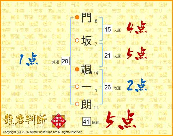 門(8画)坂(7画) 颯(14画)一(1画)朗(11画)