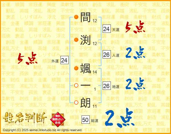 間(12画)渕(12画) 颯(14画)一(1画)朗(11画)