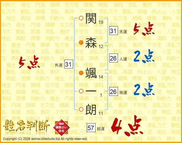 関(19画)森(12画) 颯(14画)一(1画)朗(11画)
