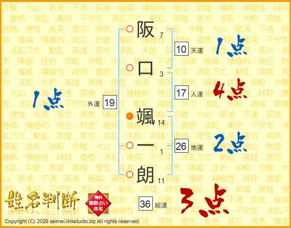 阪(7画)口(3画) 颯(14画)一(1画)朗(11画)