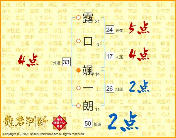 露(21画)口(3画) 颯(14画)一(1画)朗(11画)