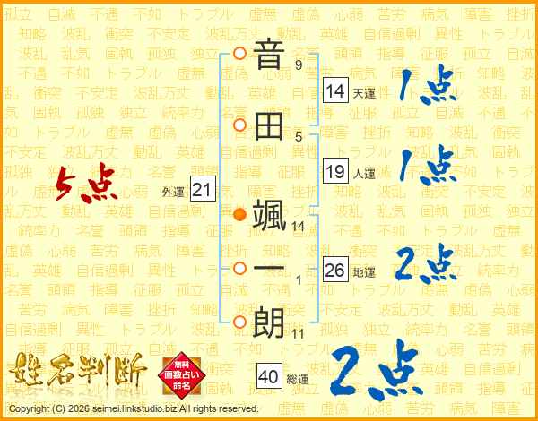 音(9画)田(5画) 颯(14画)一(1画)朗(11画)