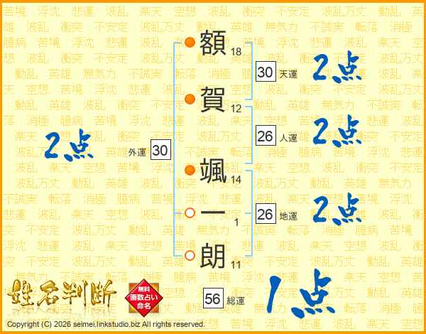 額(18画)賀(12画) 颯(14画)一(1画)朗(11画)